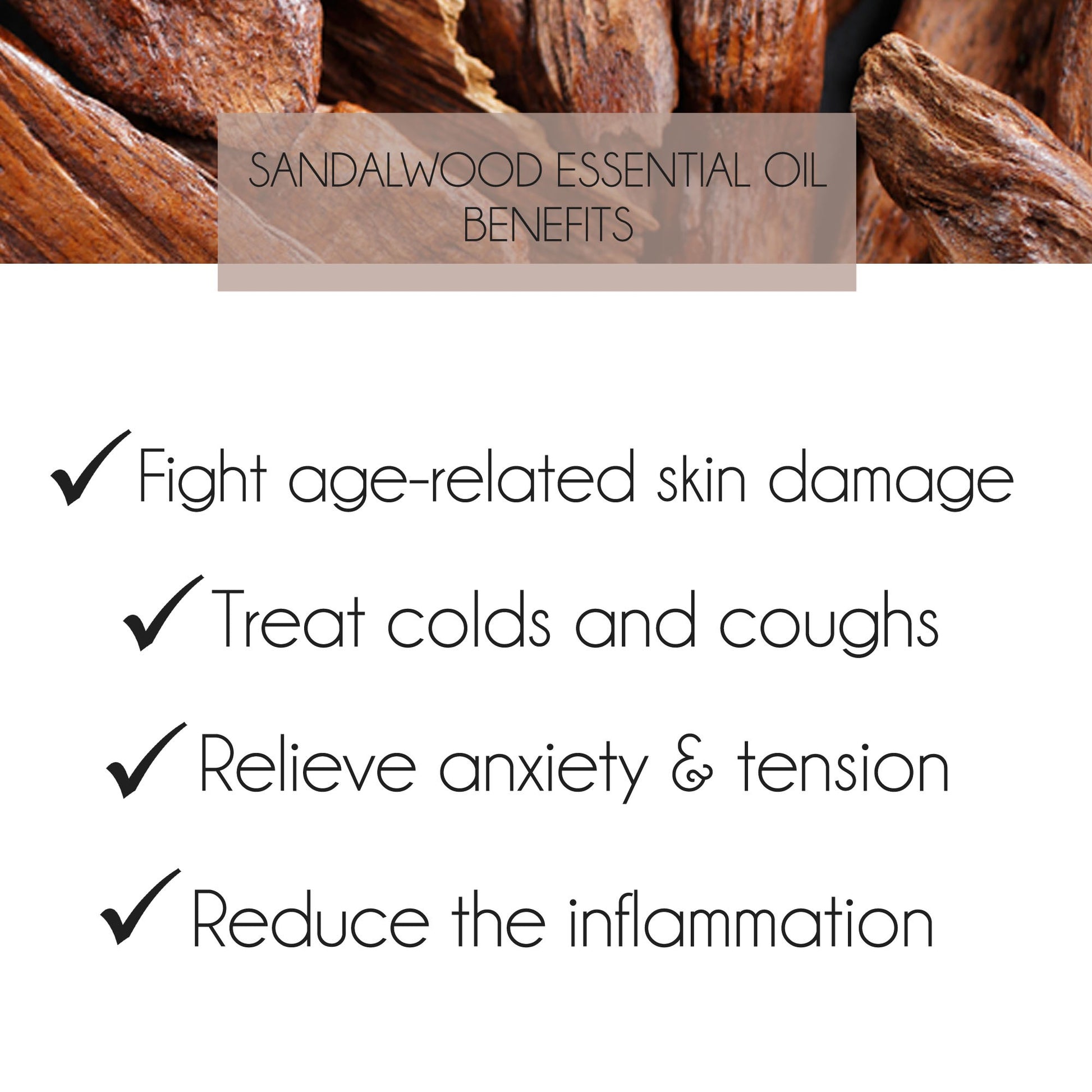 - Sandalwood Essential Oil is very beneficial to the skin; it can help reduce the appearance of skin imperfections and it promotes a healthy, smooth looking complexion.